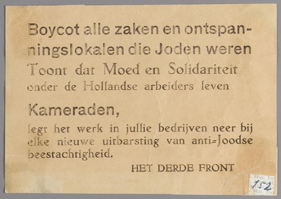 Oproep van verzetsgroep Het Derde Front om zaken waar geen joden mogen komen te boycotten, 1942