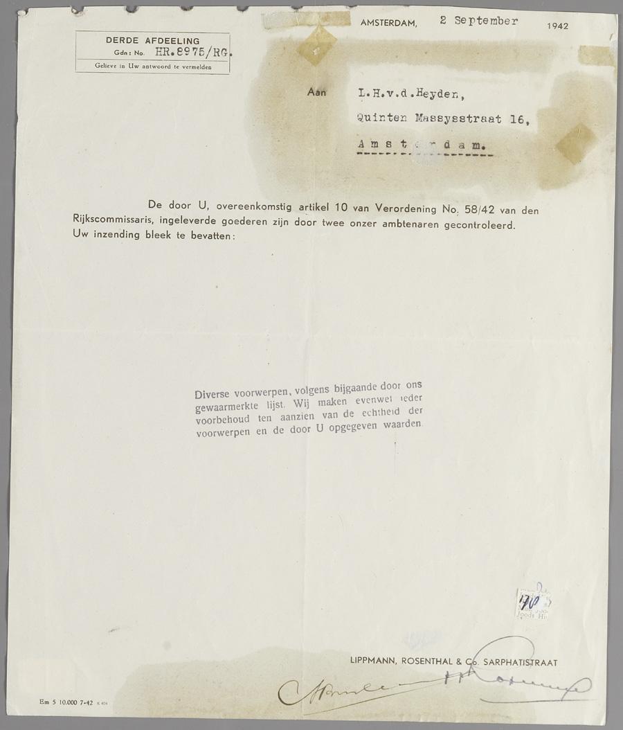 Inleveringsbewijs van Lippmann, goud-, zilver- en kunstvoorwerpen ingevolge verordening van 21 mei 1941