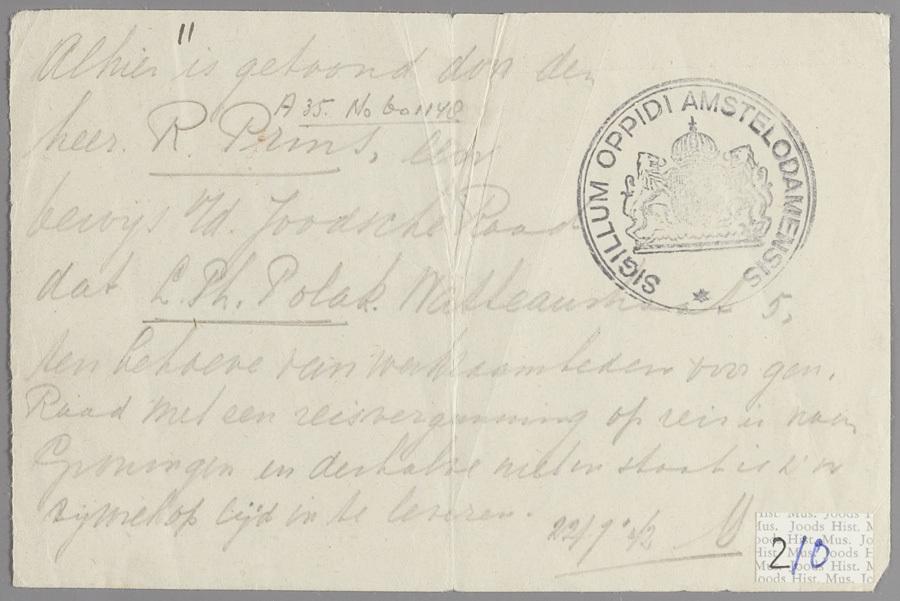 Verklaring dat dhr. R. Prins een verklaring van de Joodse Raad heeft laten zien waarin gemeld wordt dat Louis Philip Polak, wegens een reis naar Groningen niet op tijd is om zijn rijwiel in te leveren, 1942