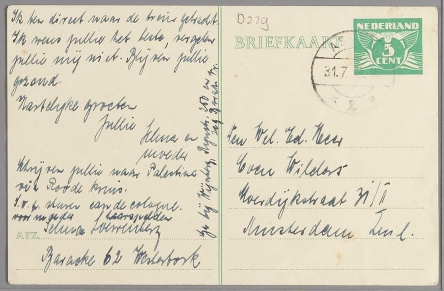 Selma Loewenberg schrijft; 'Ik ben direct naar de trein gebracht. Ik wens jullie het beste, vergeten jullie mij niet'. Een andere kaart, verzonden op 30 juni 1943 is van Susanne Zeldenrust-Wijnberg. Ook Caroline Rodrigues-van Emrik schreef de familie Wilders (Riek en Coen), mede namens haar man Max, uit Westerbork. 'En ik werk op het land aan het aardappelen rooien. Wel leuk. Je moest mij eens zien in mijn overal en klompen'. Deze kaart was verzonden op 26 augustus 1943. Zij werd op 3 september 1943 vermoord in Auschwitz.