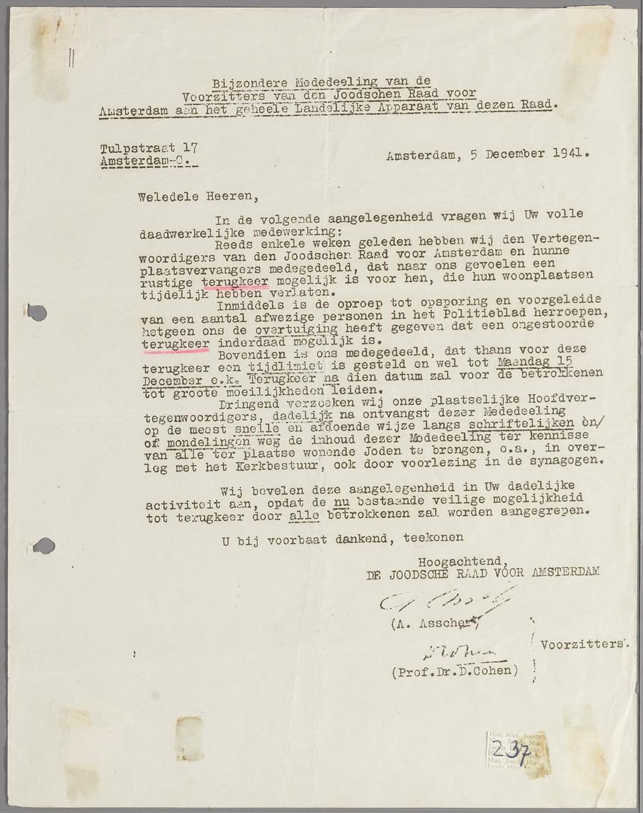 Bijzondere mededeling van de Joodse Raad over een 'rustige terugkeer' van joden die hun woonplaats hadden verlaten, december 1941