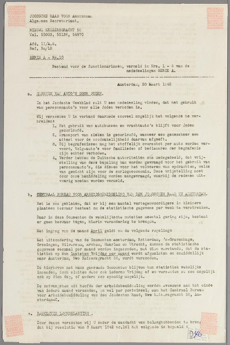 Mededelingen van de Joodsche Raad (no. 10, serie A), maart 1942