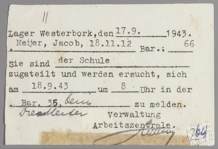 Onderwijsaanstelling voor leraar Jacob Meyer ( = Jaap Meijer) in Westerbork, september 1943