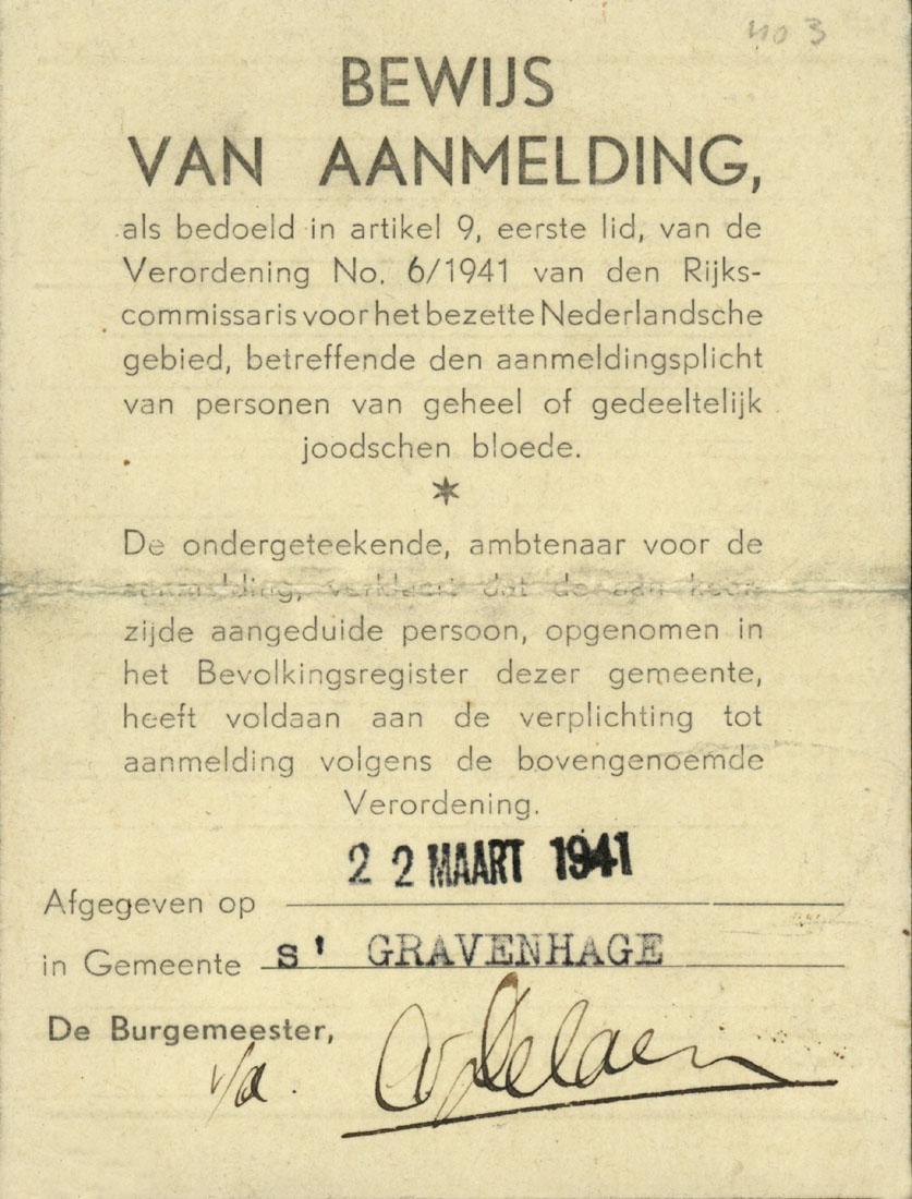 Vervalste aanmelding als jood, op naam van Barend ten Kleij, 1941