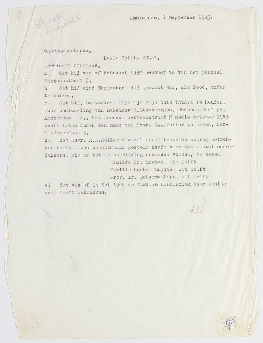 Verklaring van Louis Ph. Polak, dat hij zijn huis, nadat hij in september 1943 moest onderduiken, officieel heeft laten huren door mevr. R.A. Muller, maar dat het van 1943 tot 1945 gefungeerd heeft als onderduikadres, september 1945