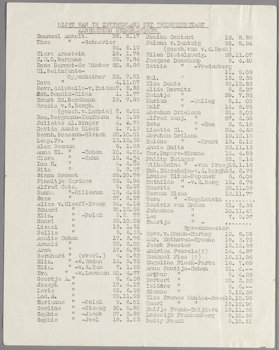 Lijst met namen van Nederlandse joden uit met name Bergen-Belsen (15) en Theresienstadt (430), die waren gearriveerd in Zwitserland