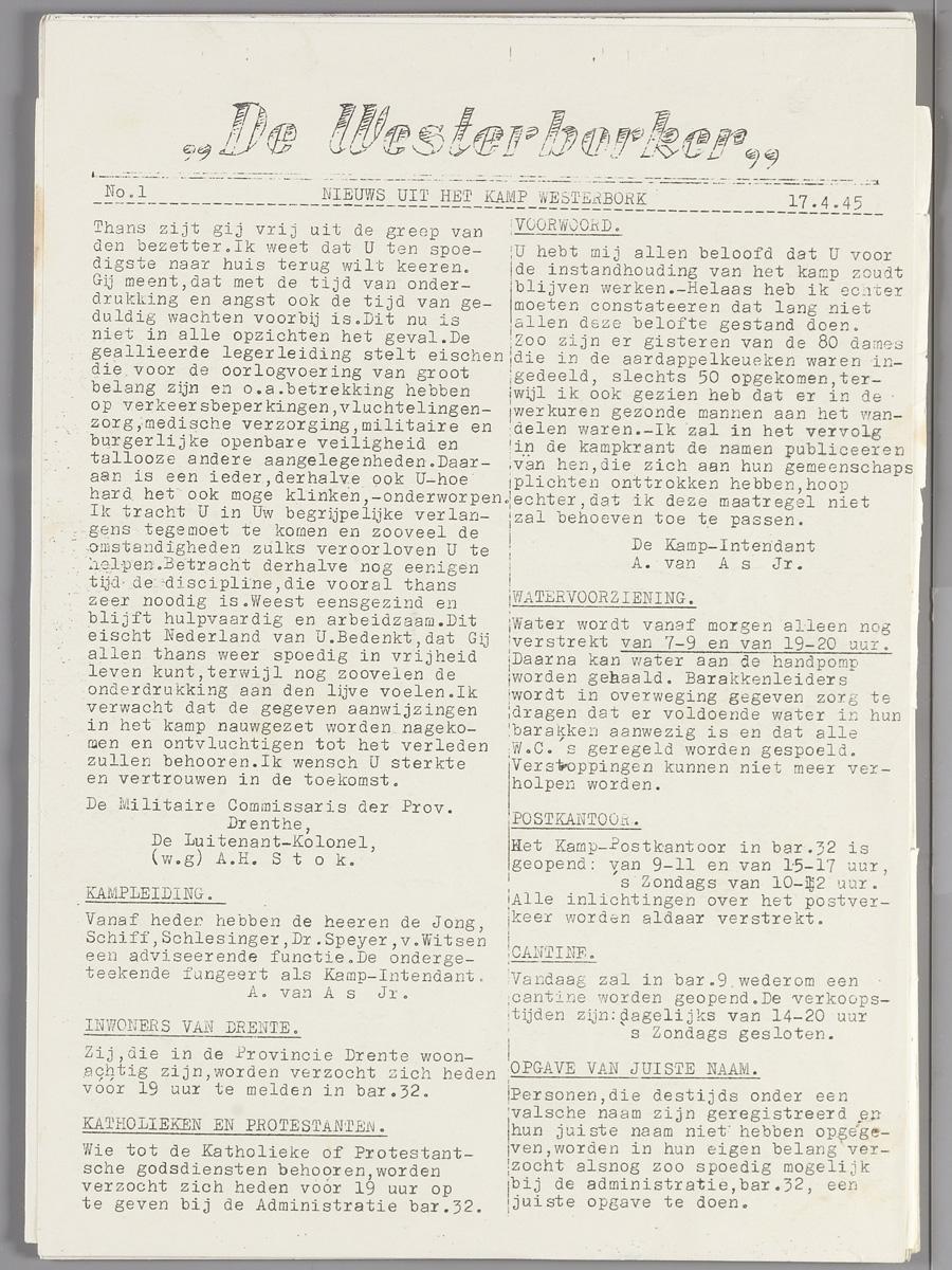 In de afleveringen staan mededelingen over post- en pakketverzending van en naar het kamp, godsdienstoefeningen, lijsten met teruggekeerde joden uit concentratiekampen, berichten over het inlichtingenbureau, mededelingen van diverse huishoudelijke aard (sport, post, wassen) wat betreft het kamp Westerbork, 'wereldnieuws', etcetera. Nieuws uit het kamp Westerbork': nr. 1 tot en met 12 (17 -30 april), nr. 13 tot en met 17 (1 mei - 5 mei), nr 19 tot en met nr. 26 (8 mei - 1i juni 1945).