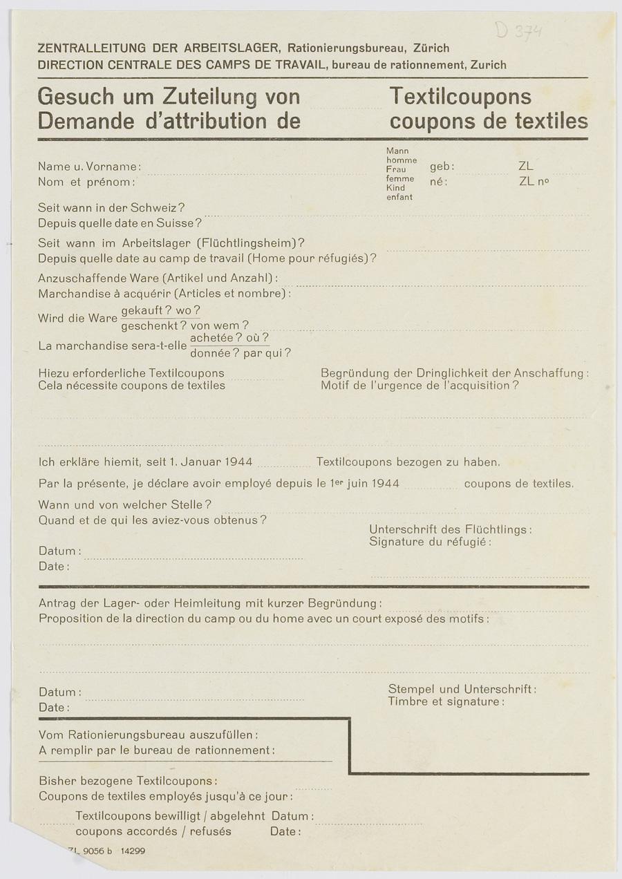 Aanvraagformulier voor textielbonnen, van de Zentralleitung der Arbeitslager in Zürich