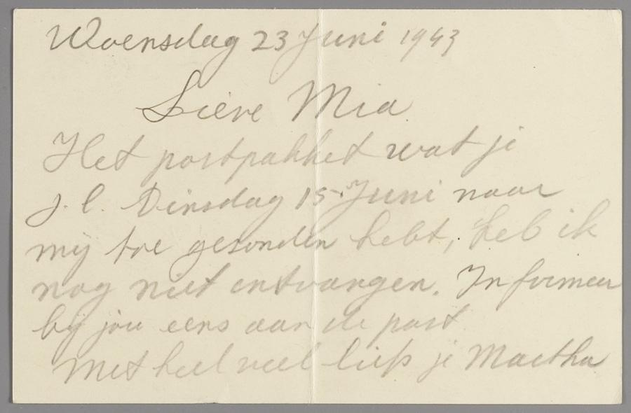Briefkaart van Martha Coini in Westerbork aan Mia Klijn in Amsterdam over postpakket, juni 1943