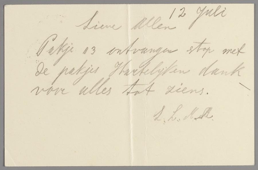Briefkaart van Liese Ladrer in Westerbork aan mevr. Klijn in Amsterdam, 1943 (?)