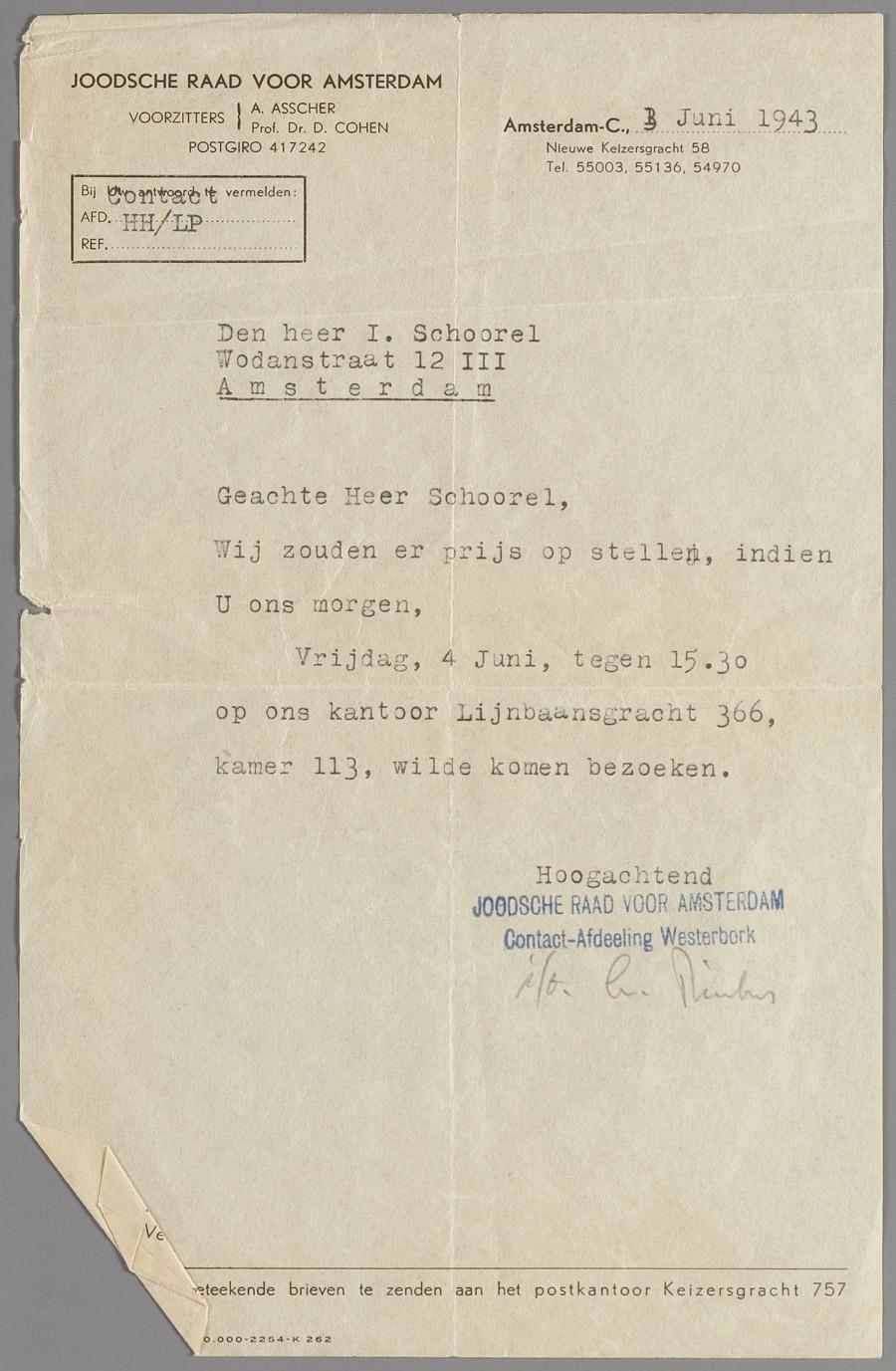 Verzoek van de Joodse Raad aan dhr. I. Schoorel om het kantoor te bezoeken, juli 1943