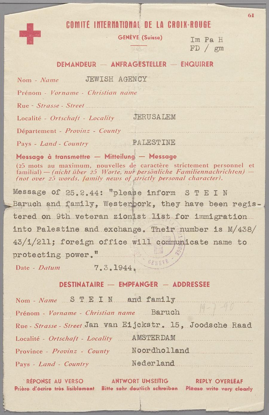 De Jewish Agency for Palestine (in Jerusalem) verzoekt de Joodse Raad om Baruch Stein (=Bernhard Stein) te informeren over de plaatsing van hem en zijn familie op Palestina-lijst. Het bericht is verstuurd op 7 maart 1944, toen dhr. Stein en zijn vrouw Else Stein-Schlesinger in Westerbork gevangen zaten.