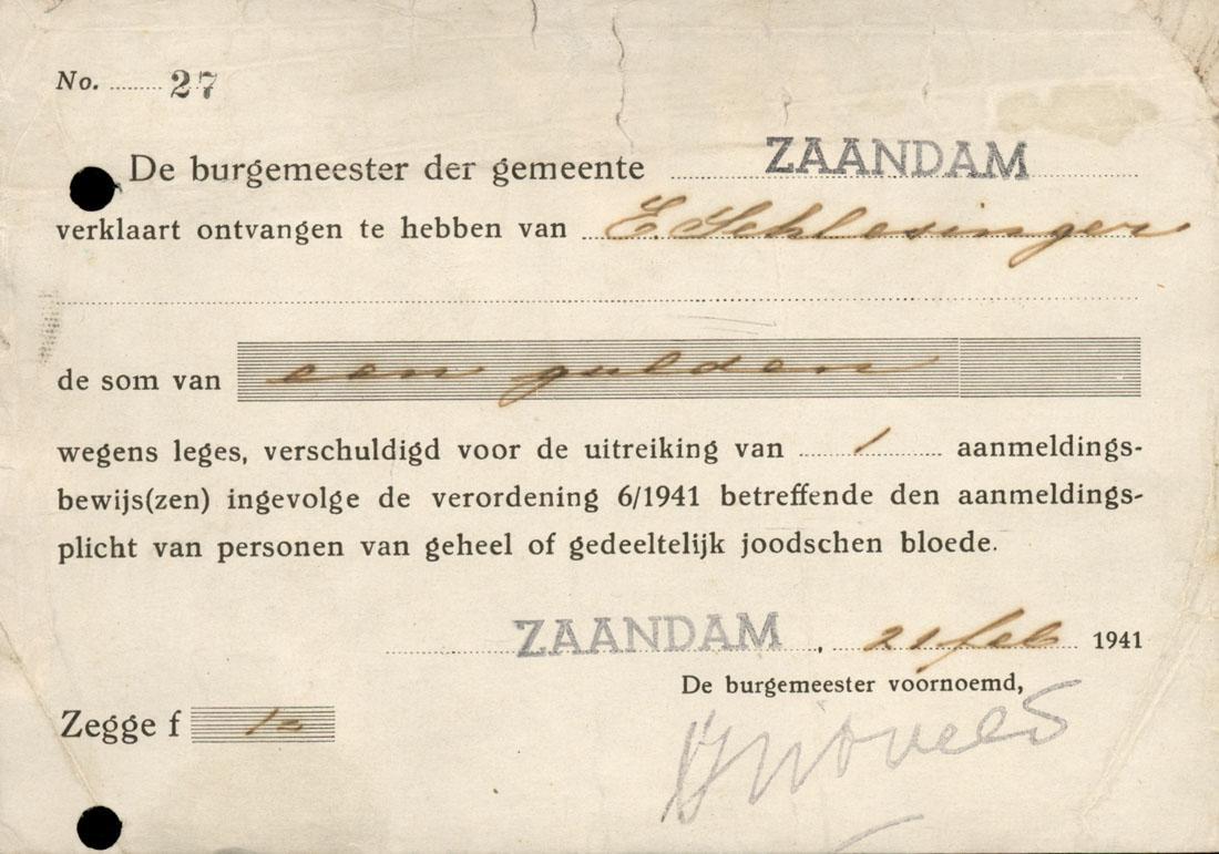Kwitantie voor Else Schlesinger als betalingsbewijs voor de uitreiking van een aanmeldingsbewijs voor joden, februari 1941