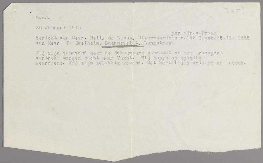 Briefje van Nelly de Leeuw in de Hollandsche Schouwburg aan mw. T. Swelheim in Barneveld, dat ze de dag erop naar Vught zullen worden overgebracht, 20 januari 1943