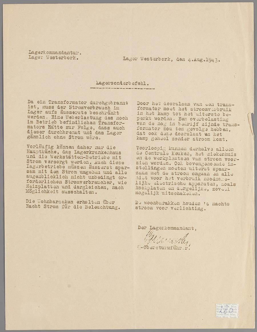 Kampverordening uit Westerbork, naar aanleiding van het uitvallen van de electriciteit. augustus 1943