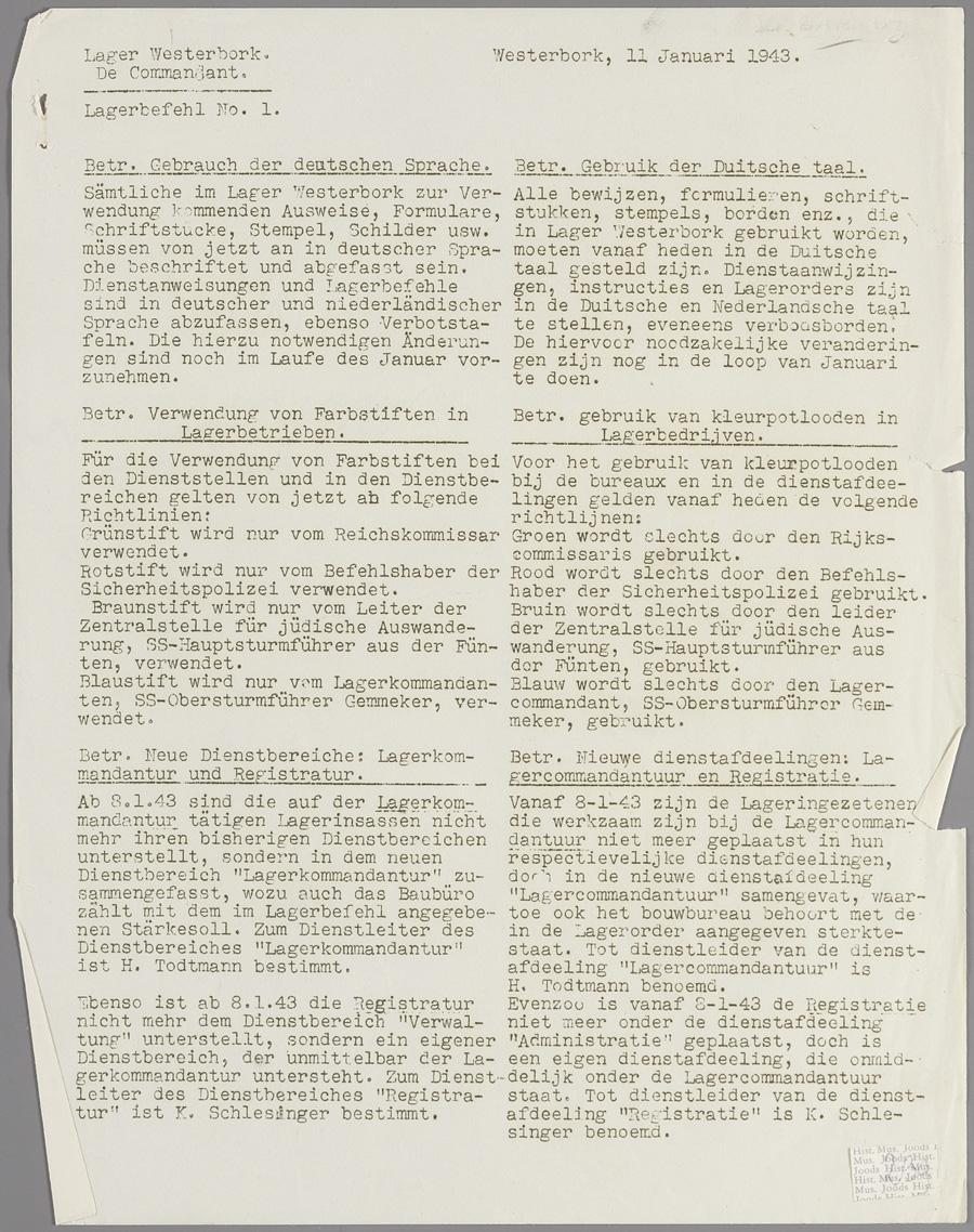 Deze verordening, kampverordening nr. 1, betreft het gebruik van de Duitse taal, het gebruik van kleurpotloden, nieuwe dienstafdelingen (Lagerkommandantur en Registratie), dienstleidersrapporten, telefoonvergunningen en arbeidskaarten.