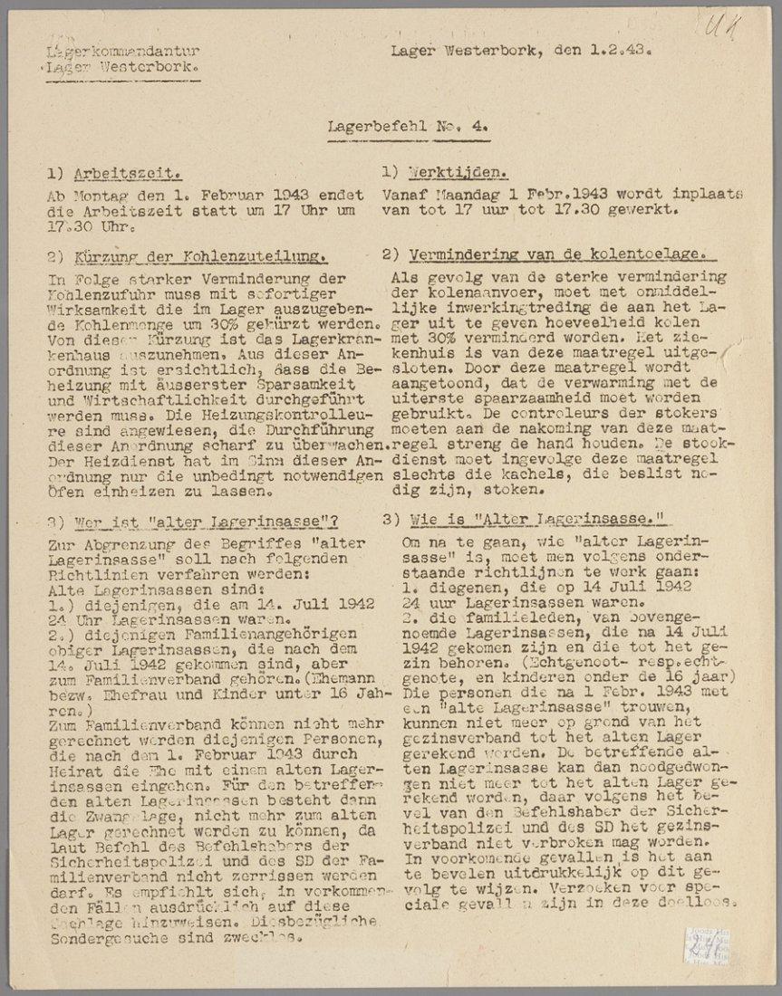 Lagerbefehl nr 4 van kamp Westerbork, februari 1943