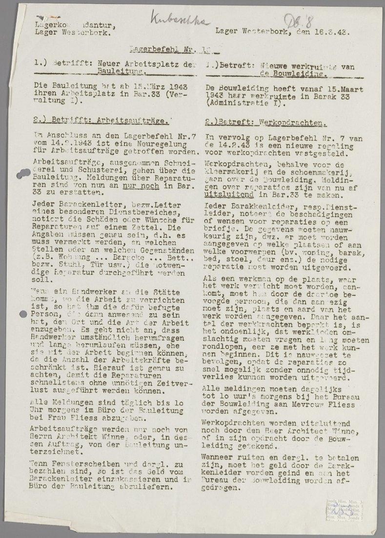 Lagerbefehl nr. 10 uit Westerbork, maart 1943