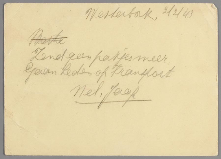 Briefkaart van Nel en Jaap [de Leeuw(?)] uit de Hollandsche Schouwburg aan familie Swelheim in Barneveld. Zij zullen naar Vught gaan, februari 1943
