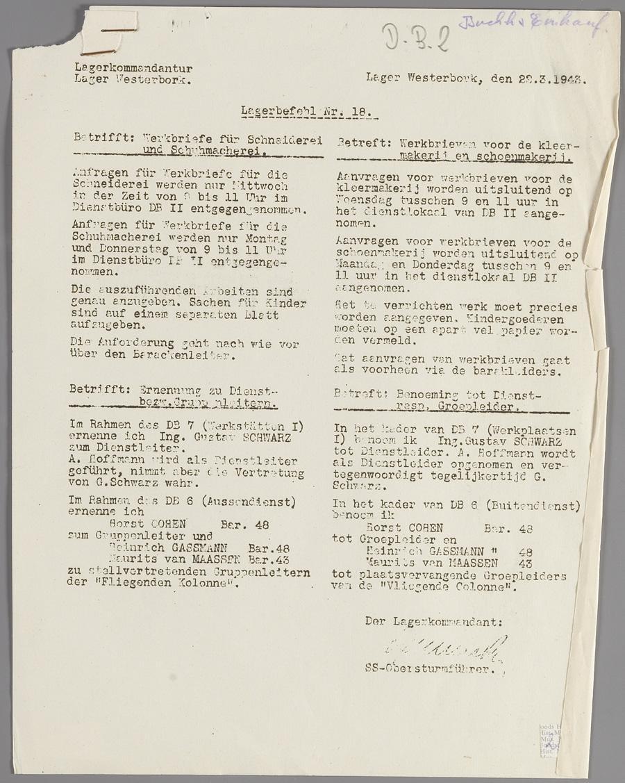 In Lagerbefehl nr. 18 uit Westerbork komen ter sprake: werkbrieven (voor de kleermakerij en de schoenmakerij), diverse benoemingen.