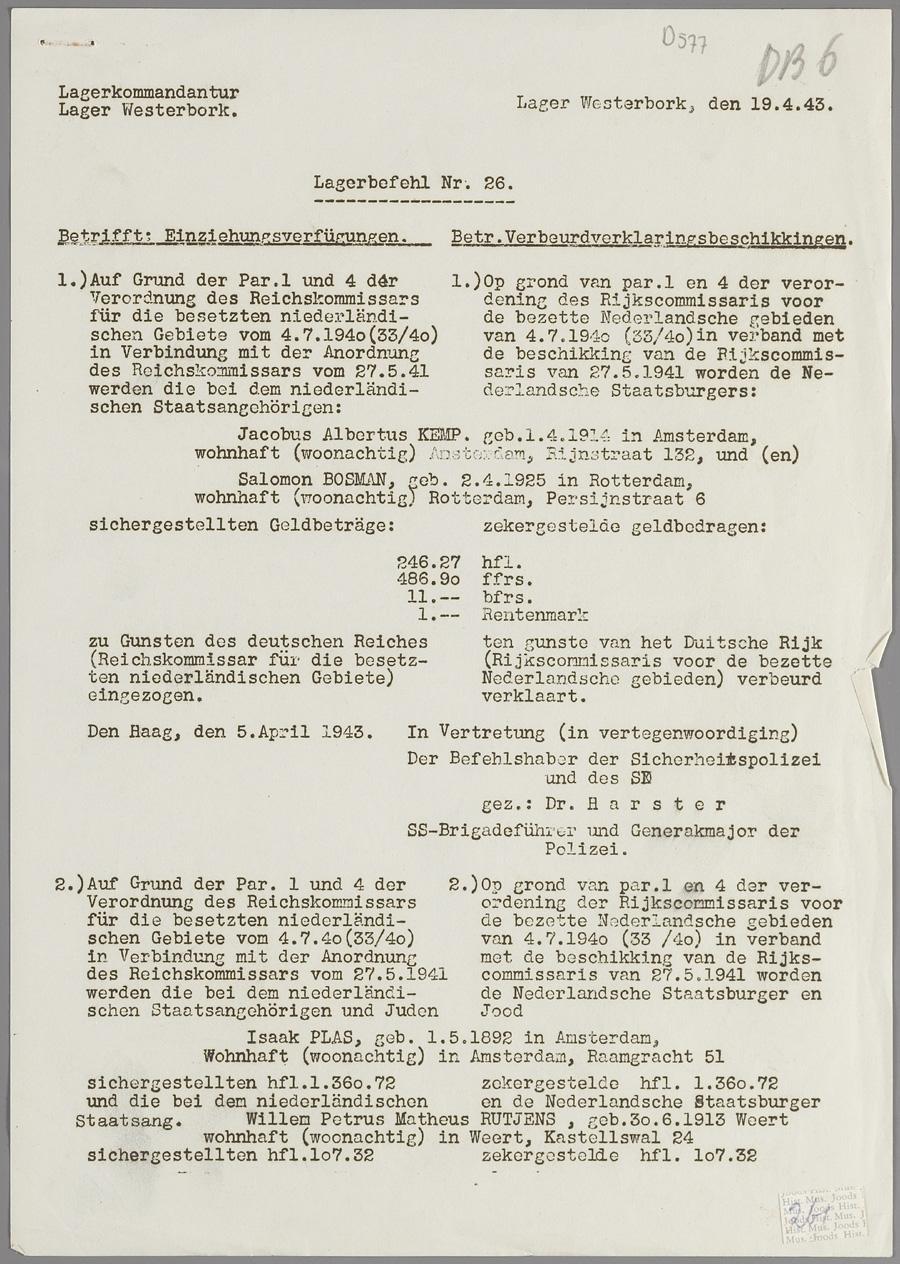 Lagerbefehl nr. 26 van kamp Westerbork, april 1943