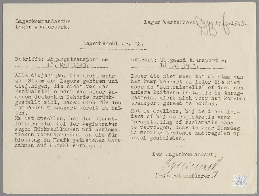 Ter sprake komt een uitgaand transport, De mededeling liet aan duidelijkheid niets te wensen over: 'Iedereen die niet meer tot de stam van het kamp behoort en ieder die niet door de "Zentralstelle" of door een andere Duitsche instantie is teruggesteld, dient zich voor het komende transport gereed te houden'. Protest was zinloos. Op 18 mei zou er een trein uit Westerbork vertrekken naar het vernietigingskamp Sobibor. Aan boord zaten 2511 mensen, waarvan er 2461 bij aankomst direct werden vergast.