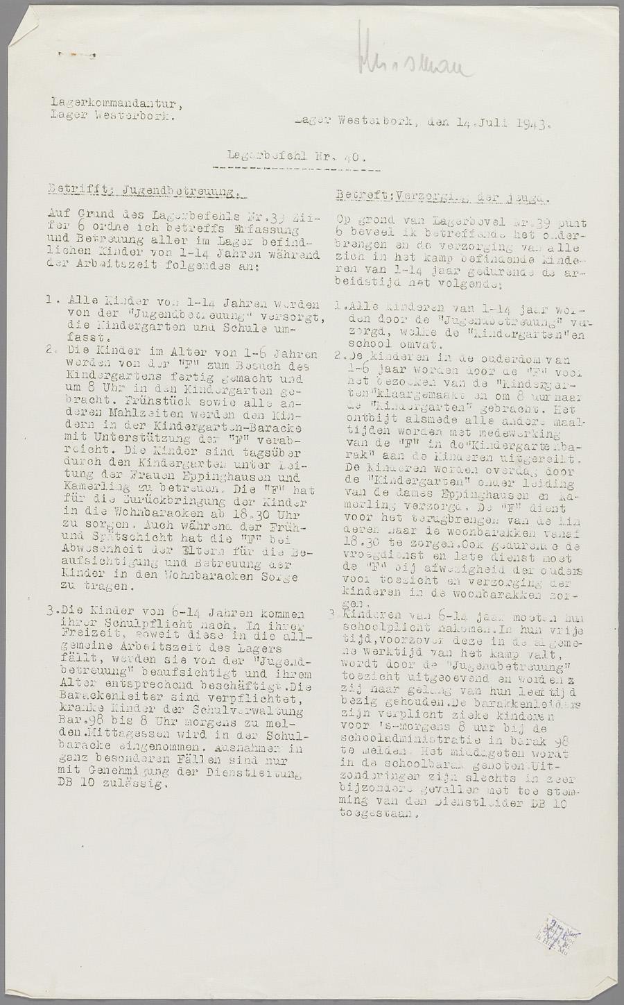 Lagerbefehl nr. 40 uit Westerbork betreft de 'verzorging der jeugd'. De voorschriften gelden voor alle kinderen van 1 tot 14 jaar in het kamp.
