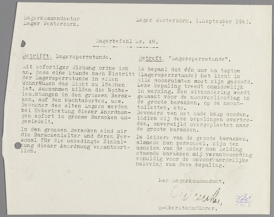 Lagerbefehl nr. 48 van kamp Westerbork, september 1943