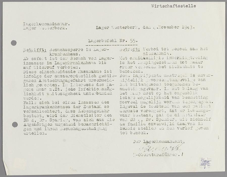 Lagerbefehl nr. 55 van kamp Westerbork, met verbod tot bezoeken van kampziekenhuiis, november 1943