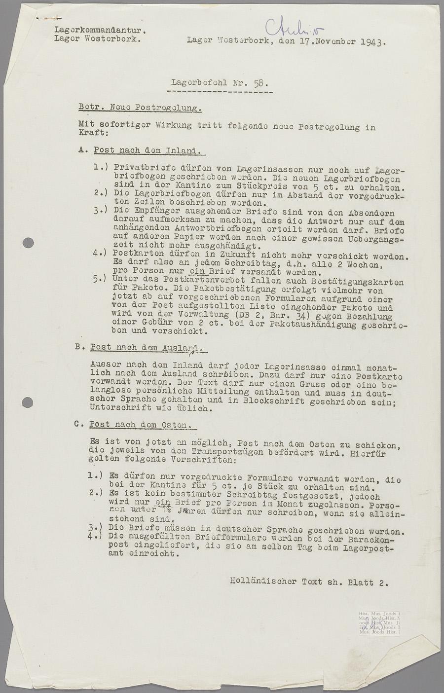 Lagerbefehl nr. 58, Westerbork, november 1943