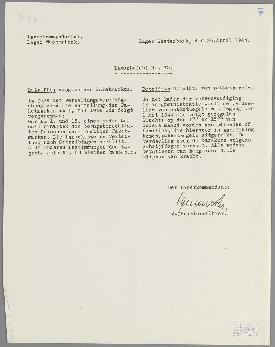 Lagerbefehl nr. 75, Westerbork, met mededeling over het versturen van pakketten en de uitgifte van pakketzegels, april 1944