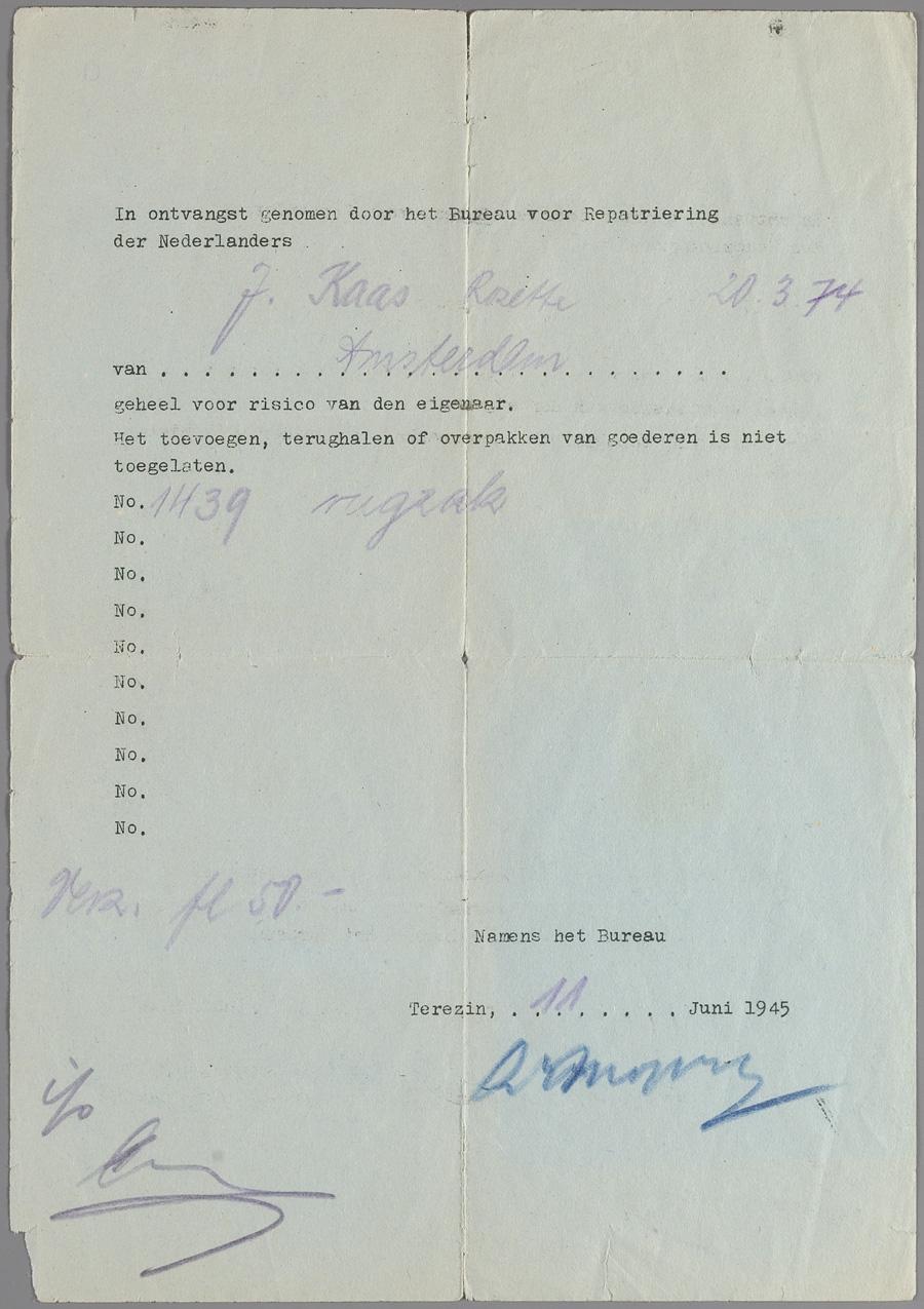 Ontvangstbewijs voor een rugzak op naam van Julia Kaas-Rozette, van het Bureau voor Repatriering der Nederlanders in Theresienstadt, juni 1945