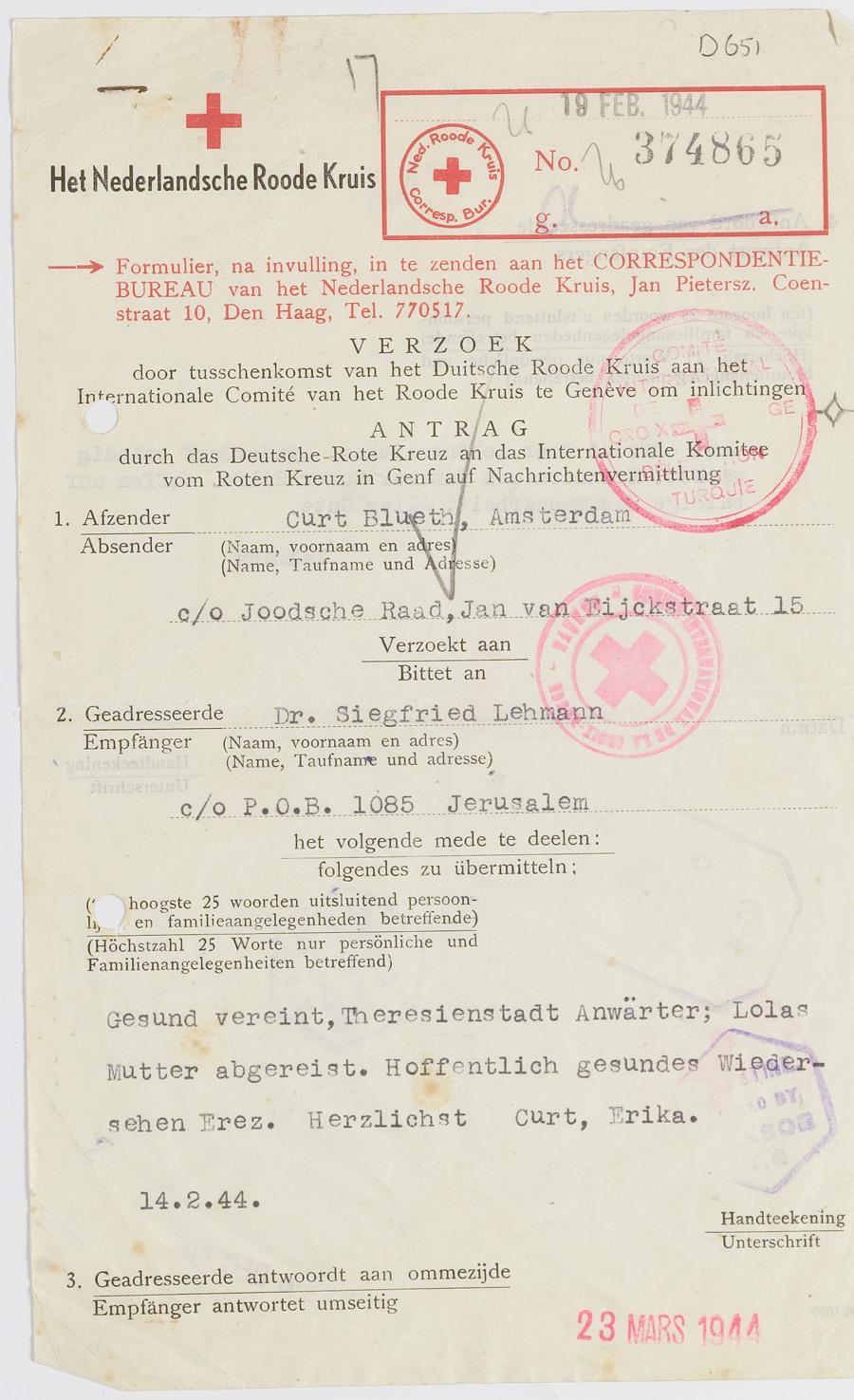 Het Rode Kruis verzorgde contact tussen Curt en Erika Blüth uit Amsterdam en Siegfried Lehman uit Jeruzalem. Curt Blüth werkte voor de Joodse Raad en verzorgde het contact tussen Amsterdam en Westerbork. Hij was getrouwd met Erika Blüth. Blüth liet Lehmann in februari 1944 weten op de lijst voor Theresienstadt te staan. Lehmann antwoordde, in december 1944, dat hij blij was met het levensteken.