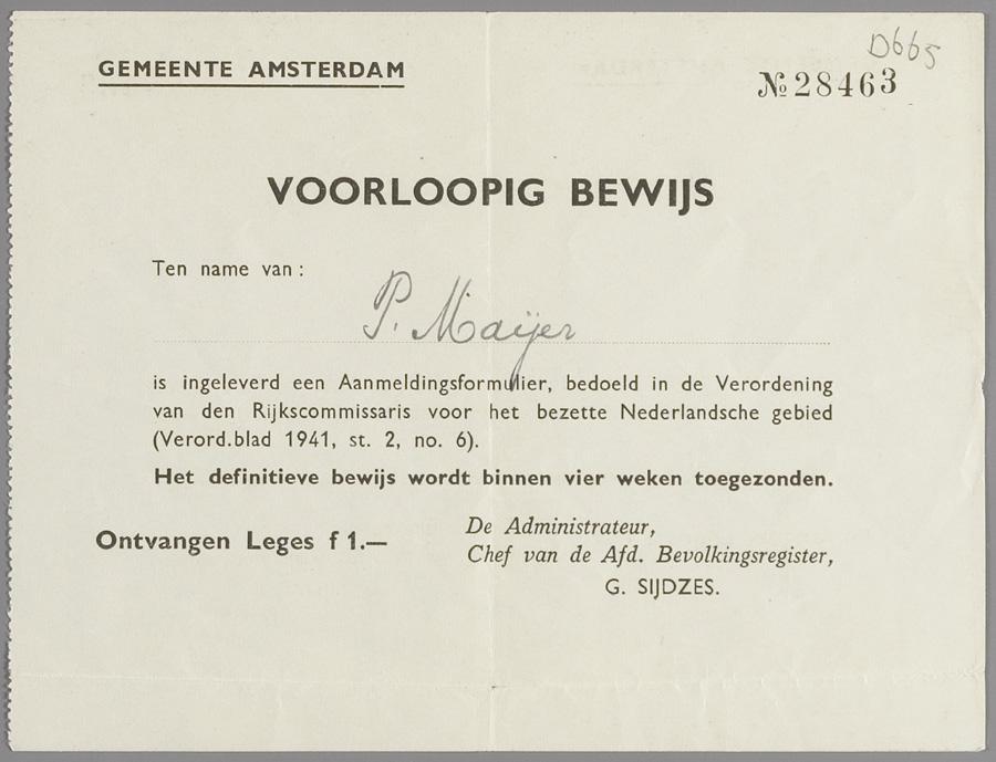 Voorlopig bewijs van inlevering aanmeldingsformulier, op naam van Paul Mayer, Amsterdam, circa 1941.
