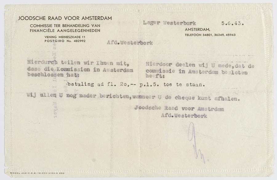 Brief aan Paul Mayer van de Commissie ter behandeling van financiele aangelegenheden, Westerbork, juni 1943