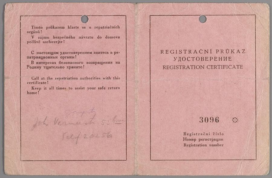 Op naam van Martin van Creveld en Elisabeth van Creveld-Cohen gestelde registratiecertificaten uitgegeven door Tsjechoslowaakse repatrieringsbureau, juni 1945