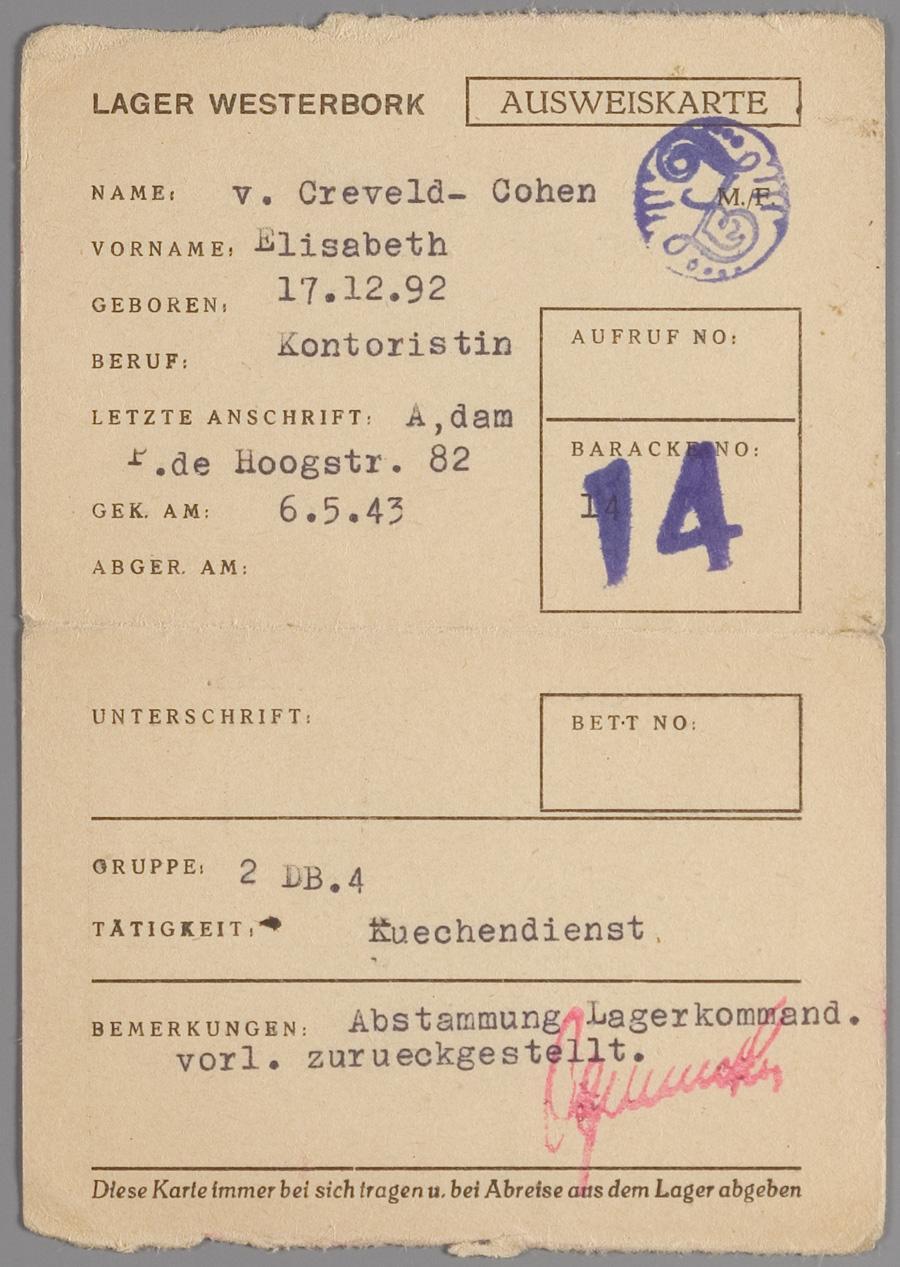 Registratiekaart uit Westerbork, op naam van Elisabeth van Creveld-Cohen, 1943