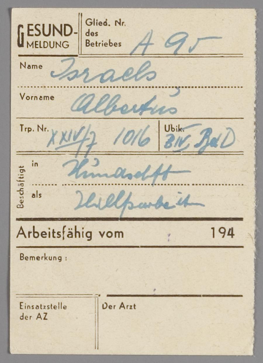 Gezondheidsverklaring ('betermelding') op naam van Albertus Israels, Theresienstadt, 1944-1945