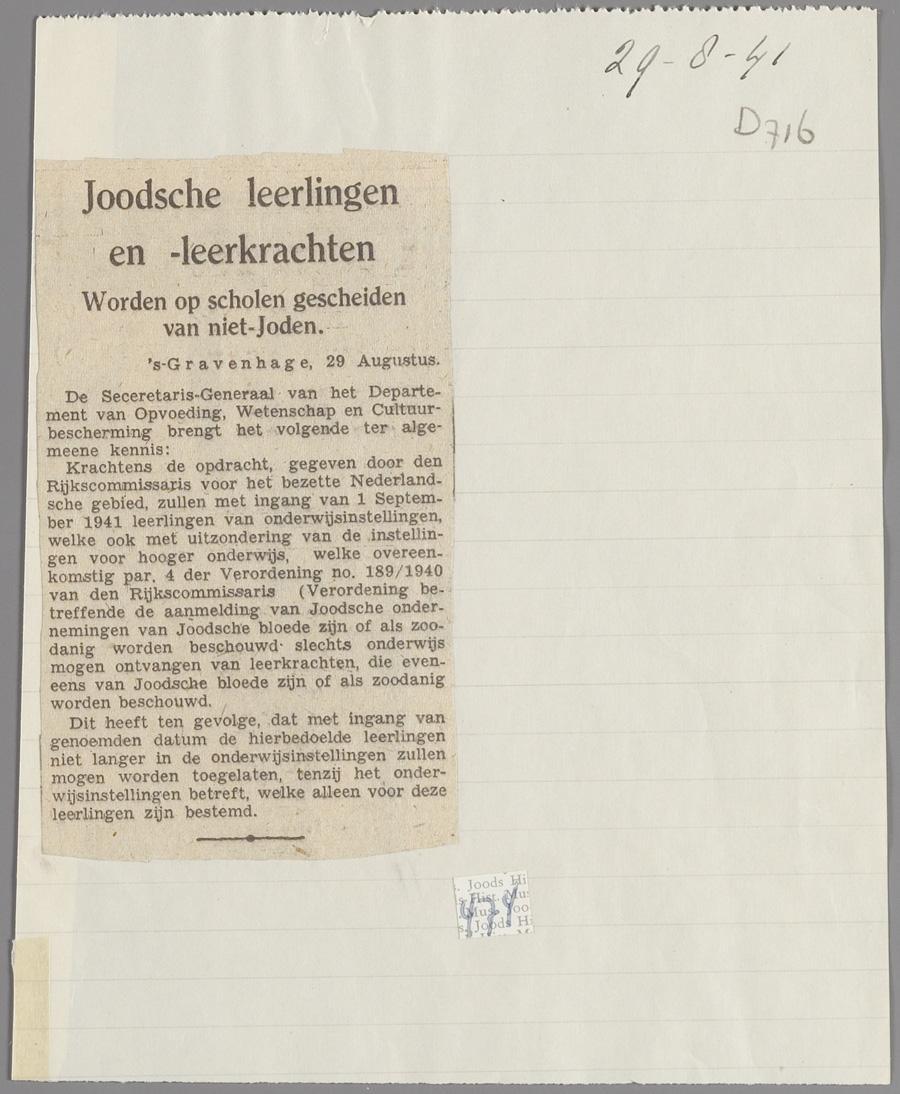 Krantenknipsel waarin de bepaling werd aangekondigd dat joodse leerlingen geen les meer mochten krijgen van niet-joodse leraren - dat betekende dat zij van niet-joodse scholen af moesten.