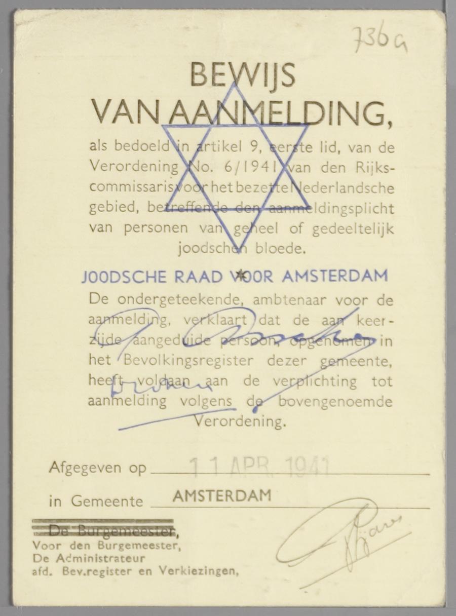 Drie aanmeldingsbewijzen voor 'personen van geheel of gedeeltelijk joodsche bloede' voor Louis Ph. Polak, zijn echtgenote Gitta Alice Polak-Cohen en hun pleegdochter Edith Landwirth, 1941
