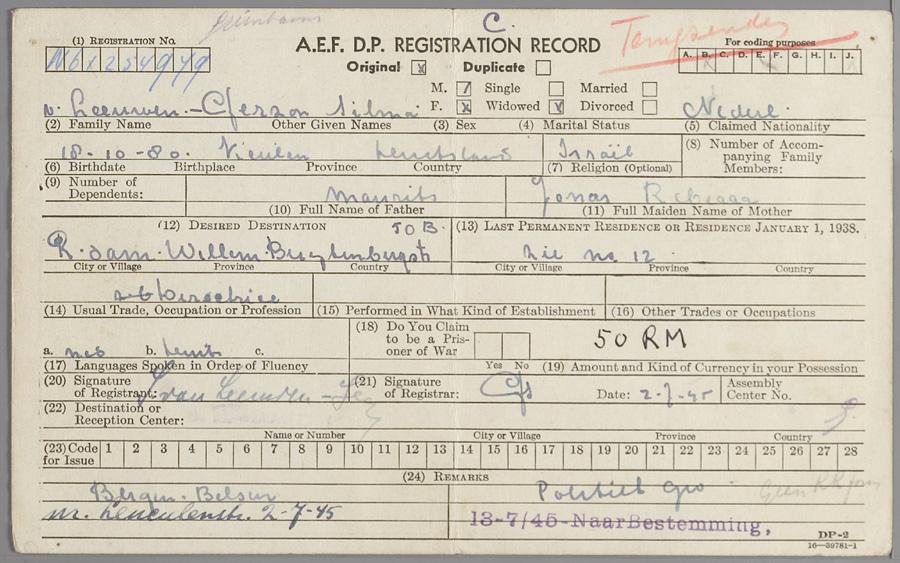 Registratiekaart van de Allied Expeditionary Force, op naam van Selma van Leeuwen-Gerzon, juli 1945