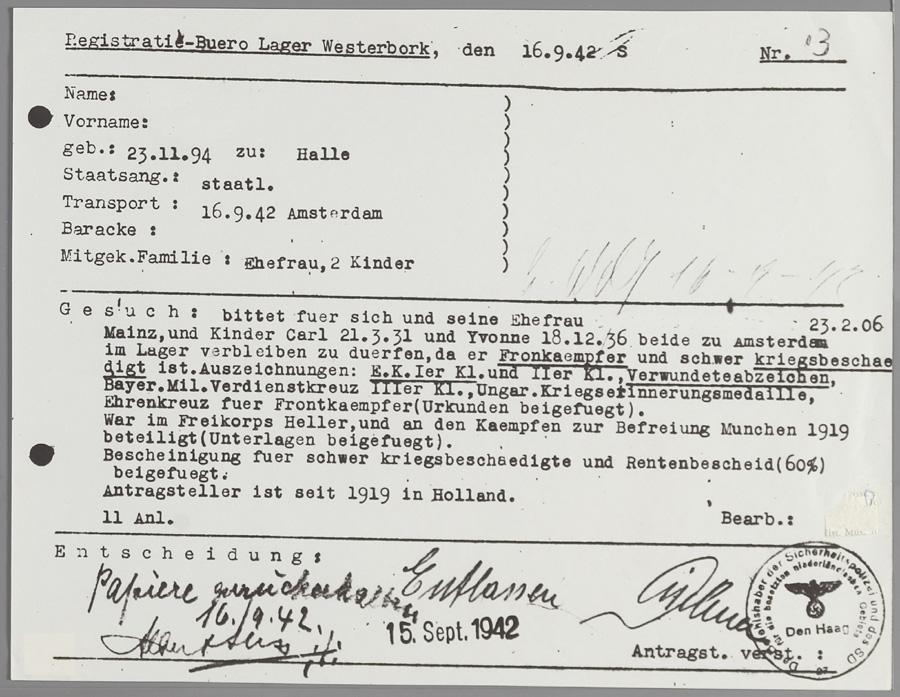 De gevangene was veelvuldig onderscheiden in het Duitse leger tijdens de Eerste Wereldoorlog en was sinds 1919 in Nederland. Hij (geboren in Halle/Saale 1894), zijn vrouw (geboren in Mainz) en hun twee in Amsterdam geboren kinderen (1931 en 1936) werden op 15 september 1942 vrijgelaten uit Westerbork.