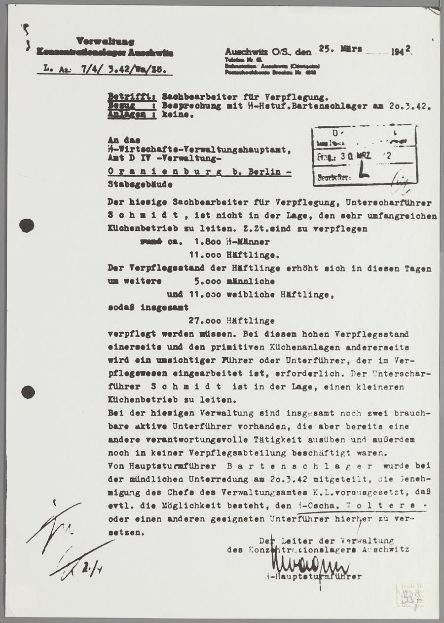 Brief van 'Verwaltung Konzentrationslager Auschwitz' aan het 'SS-Wirtschafts-Verwaltungshauptamt' in Berlijn, maart 1942