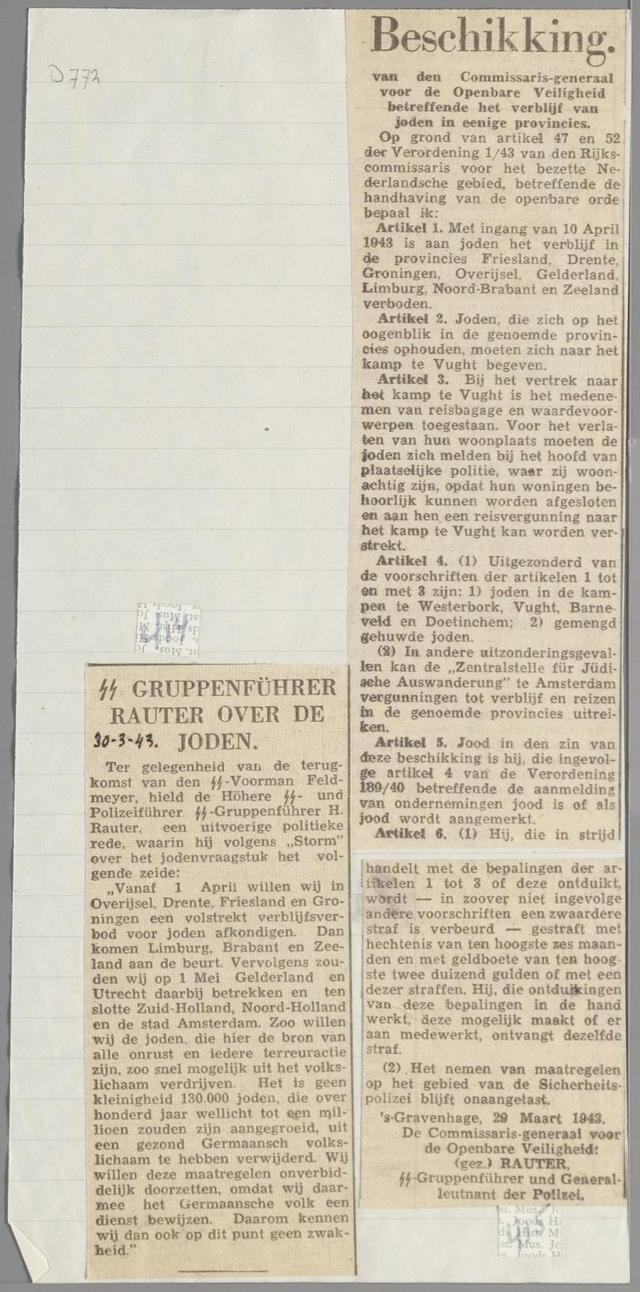 Bericht uit pro-Duitse krant o.a. over verblijfsverbod voor joden, maart 1943