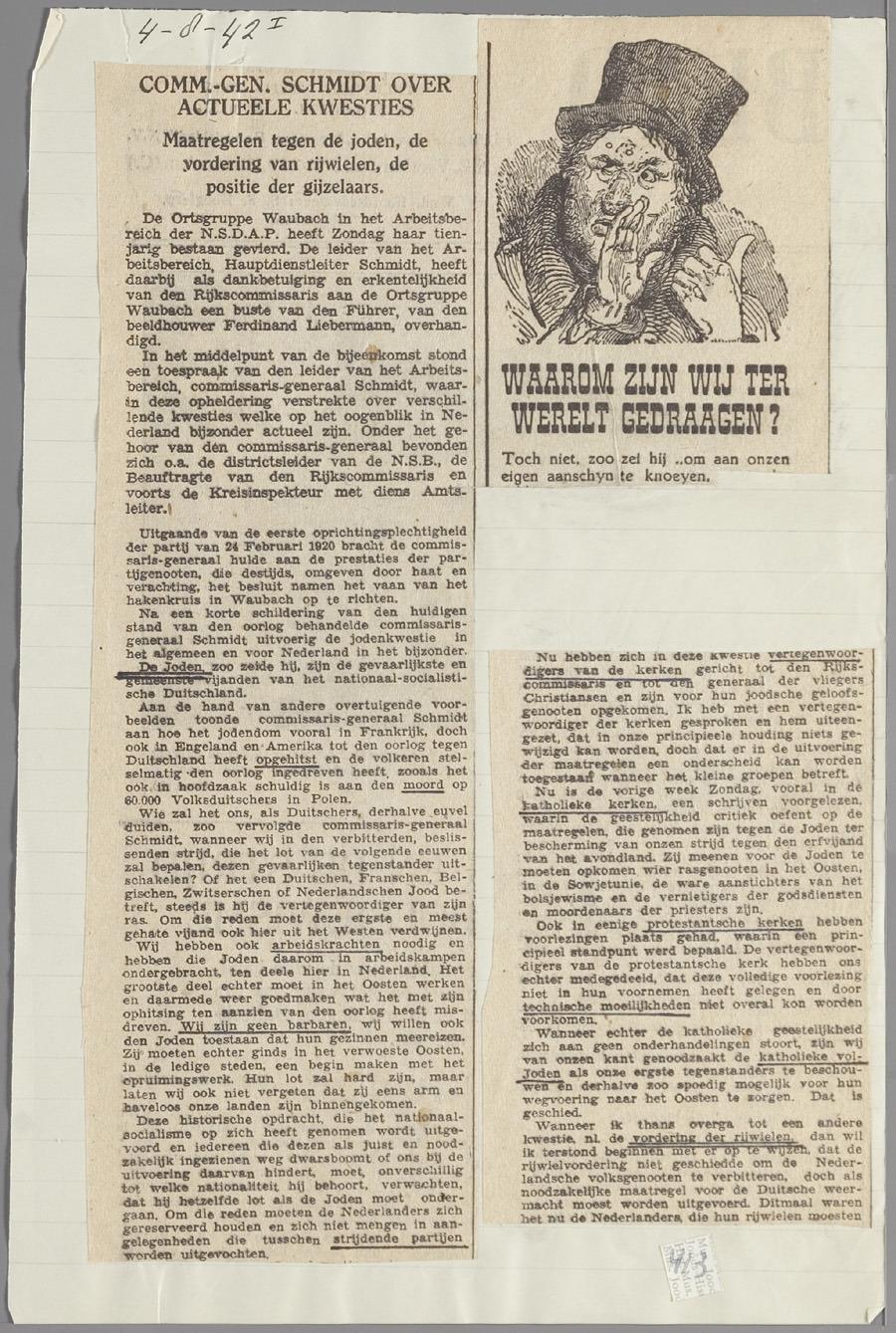 Krantenknipsel met verslag van een redevoering van Commissaris generaal Fritz Schmidt 'over actueele kwesties', 4 augustus 1942
