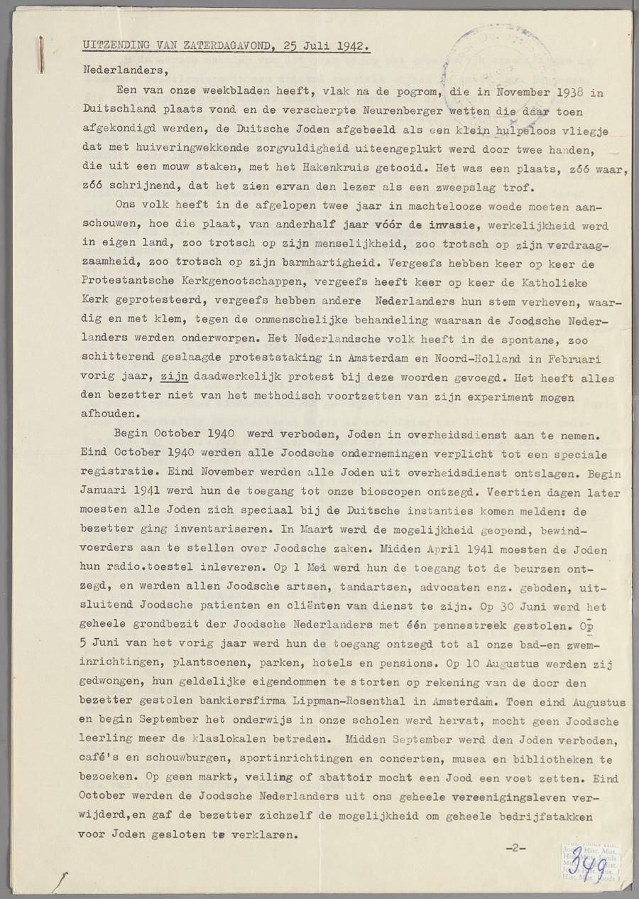 De tekst bevat de toespraak van minister president Gerbrandy. Daarnaast komen diverse anti-joodse maatregelen ter sprake.