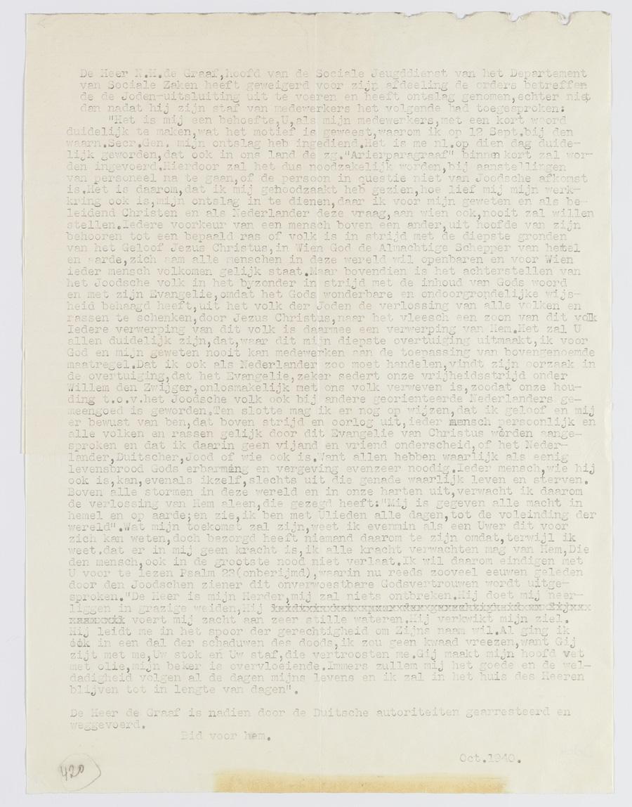 Tekst van rede uitgesproken door N.H. de Graaf, hoofd van de Sociale Jeugddienst van het Departement van Sociale zaken, toen hij zijn ontslag nam omdat hij weigerde anti-joodse maatregelen uit te voeren, oktober 1940
