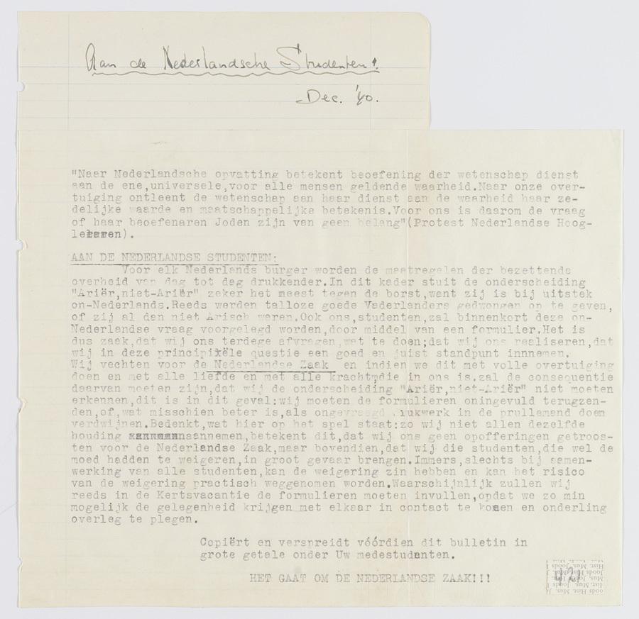"Aan de Nederlandsche Studenten ! - Dec. '40". De tekst bevat een protest van de Nederlandse studenten tegen de 'scheiding Ariers- niet-Ariers', een van de maatregelen die de Duitsers trofffen in de eerste fase van de jodenvervolging in Nederland - de isolatie van de joden ten opzichte van andere Nederlanders.