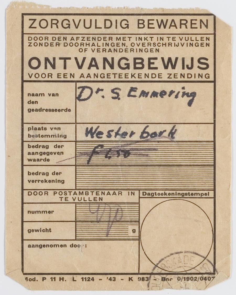Ontvangstbewijs van een aangetekende zending op naam van S. Emmering, Westerbork, 1943