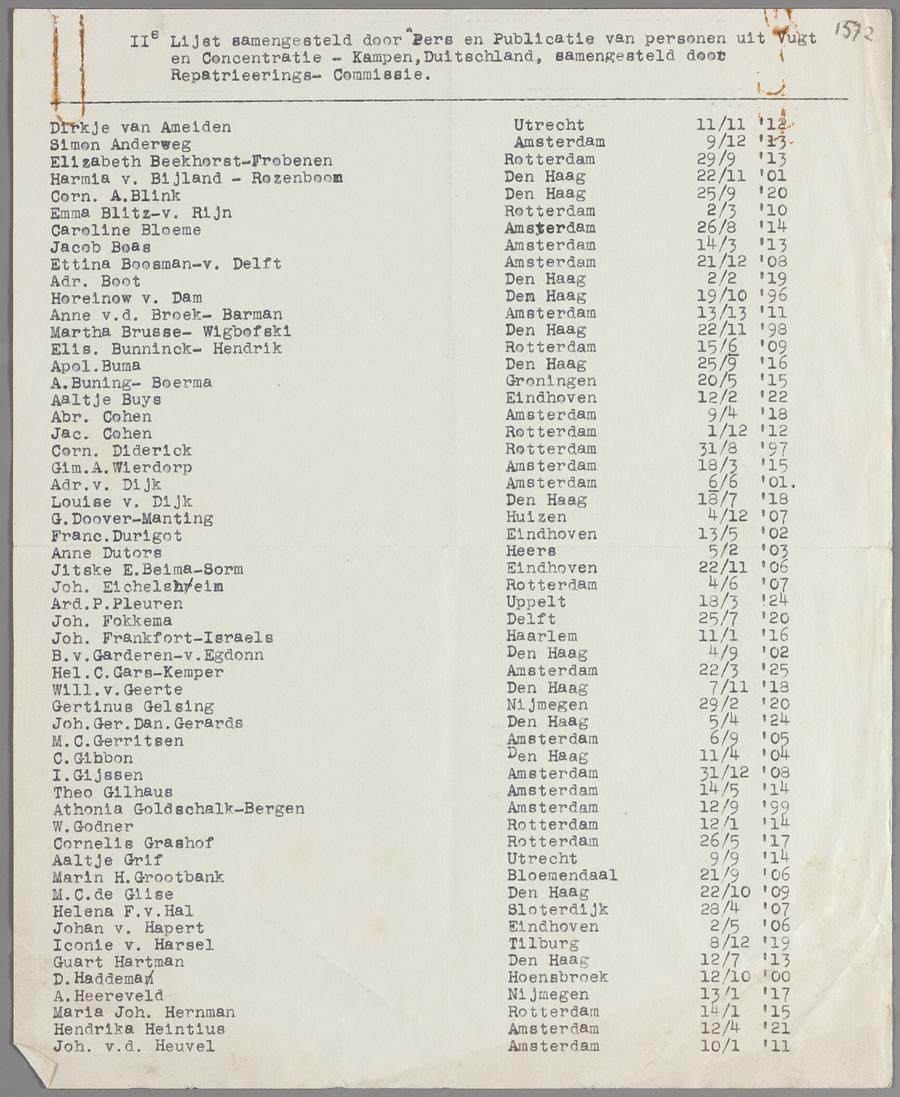 2e lijst samengesteld door de 'Repatrieerings Commissie', betreffende personen uit kamp Vught en diverse concentratiekampen in Duitsland, 1945.